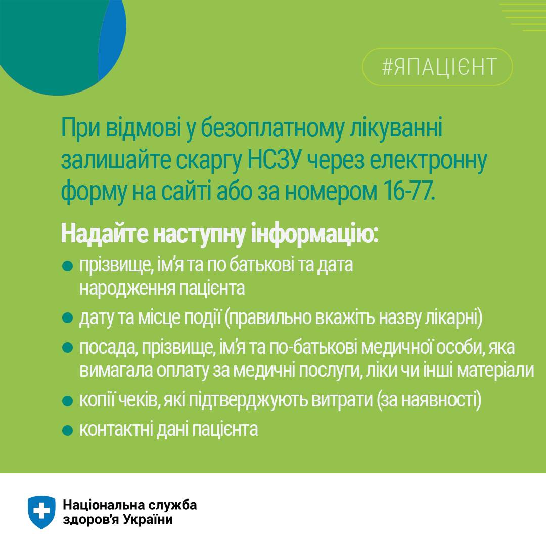 4️⃣ При відмові у безоплатному лікуванні залишайте скаргу НСЗУ через електронну форму на сайті: https://cutt.ly/XeniBCCT, або за номером 16-77.