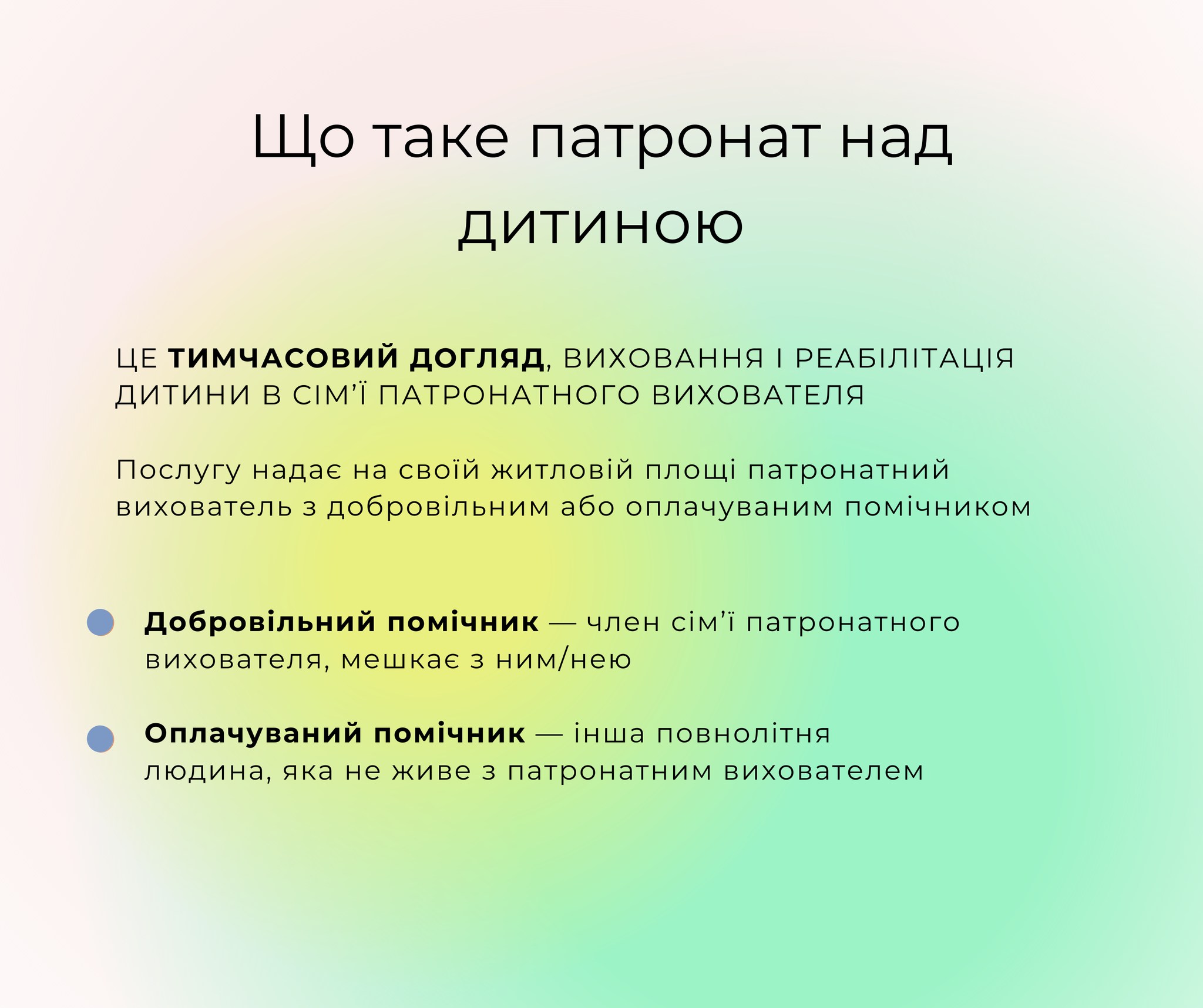 Патронат над дитиною — це послуга в громадах, завдяки якій діти залишаються в сімейному середовищі навіть тоді, коли батьки з тих чи інших причин тимчасово не можуть про них піклуватися.